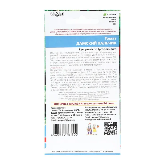 Семена Томат "Дамский Пальчик", детерминантный 20 шт — Характеристики