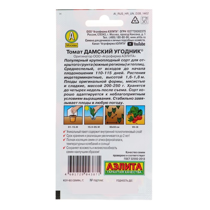 Как сажать. Семена сеют на рассаду в марте. Пикируют в фазе 1–2 настоящих листьев. Посадка рассады: в середине мая — под плёнку, в начале июня — в открытый грунт. Возраст рассады — 60–65 дней (в фазе 5–7 настоящих листьев). Схема посадки: 60 × 50 см.