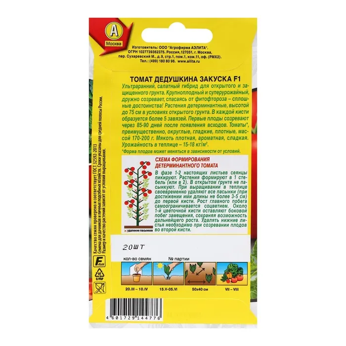 Семена Томат "Дедушкина закуска" F1," ц/п, 20 шт — Характеристики