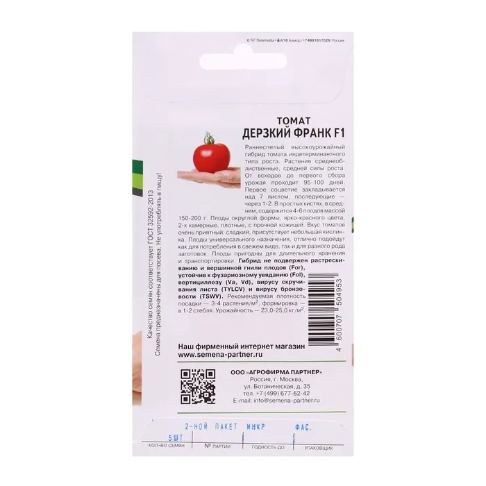 Раннеспелый высокоурожайный индетерминантный гибрид томата. От всходов до первого сбора урожая проходит 95-100 дней. Первое соцветие закладывается над 7 листом, последующие — через 1-2. В простых кистях, в среднем, формируется 4-6 плодов массой 150-200 г. Плоды округлой формы, ярко-красного цвета, 2-х камерные, плотные, с прочной кожицей. Вкус томатов очень приятный: сладкий, присутствует небольшая кислинка. Плоды универсального назначения, отлично подойдут как для потребления в свежем виде, так и для разного рода заготовок. Плоды пригодны для длительного хранения и транспортировки. Гибрид не подвержен растрескиванию и вершинной гнили плодов, устойчив к фузариозному увяданию (Fol), вертициллезу (Va, Vd), вирусу скручивания листа (TYLCV) и вирусу бронзовости (TSWV). Рекомендуемая плотность посадки — 3-4 растения/м², формировка — в 1-2 стебля. Урожайность — 23,0-25,0 кг/м².