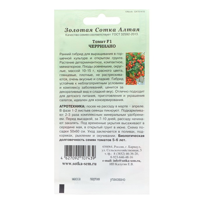Семена Томат F1 «Черринано», ранний, 0.1 г, «Золотая Сотка Алтая» — Характеристики