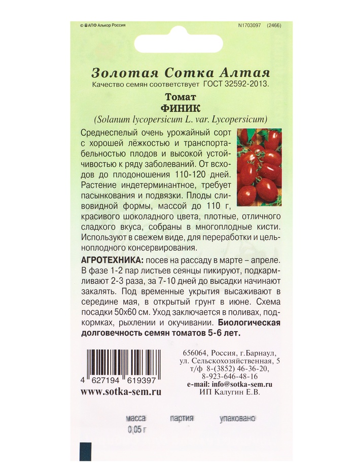 Семена Томат «Финик», 0.05 г, среднеспелый, индетерминантный, «Золотая Сотка Алтая» — Характеристики