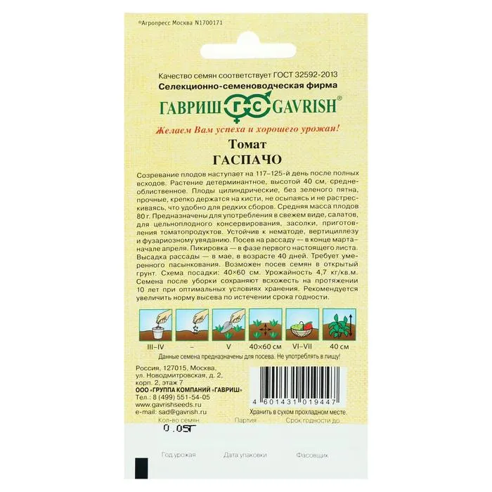 Созревание плодов наступает на 117-125-й день после полных всходов. Растение детерминантное, высотой 40 см, среднеоблиственное. Плоды цилиндрические, без зеленого пятна, прочные, крепко держатся на кисти, не осыпаясь и не растрескиваясь, что удобно для редких сборов. Средняя масса плодов 80 г. Предназначены для употребления в свежем виде, салатов, для цельноплодного консервирования, засолки, приготовления пасты и соков. Сорт устойчив к нематоде, вертициллезу и фузариозному увяданию. Урожайность 4,7 кг/м2. Посев на рассаду — в конце марта – начале апреля. Пикировка в фазе первого настоящего листа. Высадка рассады — в мае в возрасте 40 дней. Требует умеренного пасынкования. Возможен посев семян в открытый грунт. Схема посадки: 40х60 см.