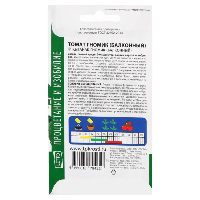 Семена Томат "Гномик", балконный, ранний, детерминантный,низкорослый, 0,05 г — Характеристики