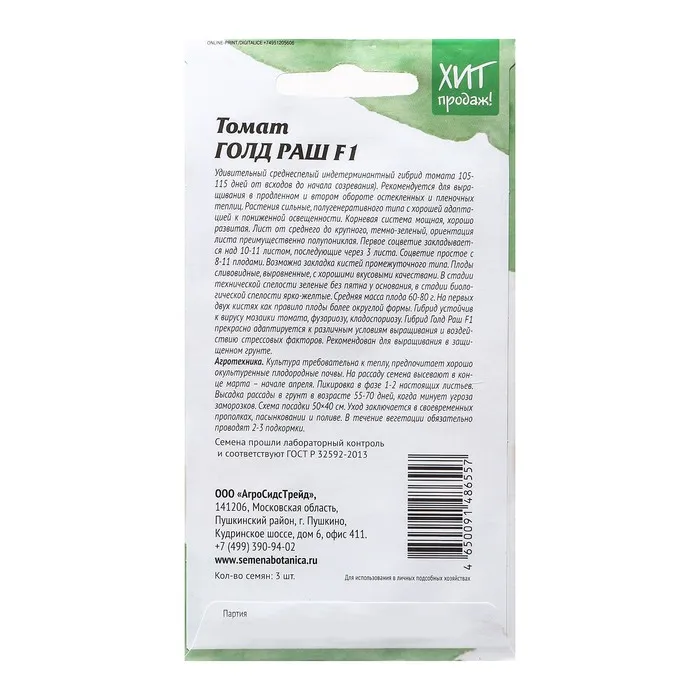 Удивительный среднеспелый индетерминантный гибрид томата 105-115 дней от всходов до начала созревания). Рекомендуется для выращивания в продленном и втором обороте остекленных и пленочных теплиц. Растения сильные, полугенеративного типа с хорошей адаптацией к пониженной освещенности. Корневая система мощная, хорошо развитая. Лист от среднего до крупного, темно-зеленый, ориентация листа преимущественно полупониклая. Первое соцветие закладывается над 10-11 листом, последующие через 3 листа. Соцветие простое с 8-11 плодами. Возможна закладка кистей промежуточного типа. Плоды сливовидные, выровненные, с хорошими вкусовыми качествами. В стадии технической спелости зеленые без пятна у основания, в стадии биологической спелости ярко-желтые. Средняя масса плода 60-80 г. На первых двух кистях как правило плоды более округлой формы. Гибрид устойчив к вирусу мозаики томата, фузариозу, кладоспориозу. Гибрид Голд Раш F1 прекрасно адаптируется к различным условиям выращивания и воздействию стрессовых факторов. Рекомендован для выращивания в защищенном грунте.