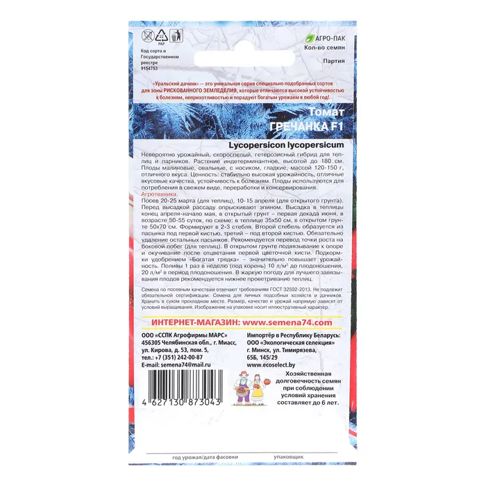 В марте семена высевают на слегка утрамбованный грунт, мульчируют торфом или почвенным слоем 1 см, поливают теплой водой через ситечко, накрывают пленкой и ставят в теплое (около 25°С) место. После появления всходов пленку снимают, рассаду размещают в светлом месте. В течение 5-7 суток температуру поддерживают на уровне 15-16°С, затем повышают до 20-22°С. В фазе 1-2 настоящих листьев рассаду пикируют. В фазе 9-10 настоящих листьев высаживают в защищенный или открытый грунт с соблюдением посадочного расстояния 40х40 см. Индетерминантные томаты формируют в 1-2 стебля, удаляя пасынки. При достижении растениями верха теплицы основной стебель прищипывается. При выращивании в теплице рекомендованы магниевые подкормки по вегетации. В период налива плодов рекомендуется произвести калийную подкормку. Урожай собирают в течение сезона по мере созревания. Недозревшие плоды могут дозариваться не на растении."
