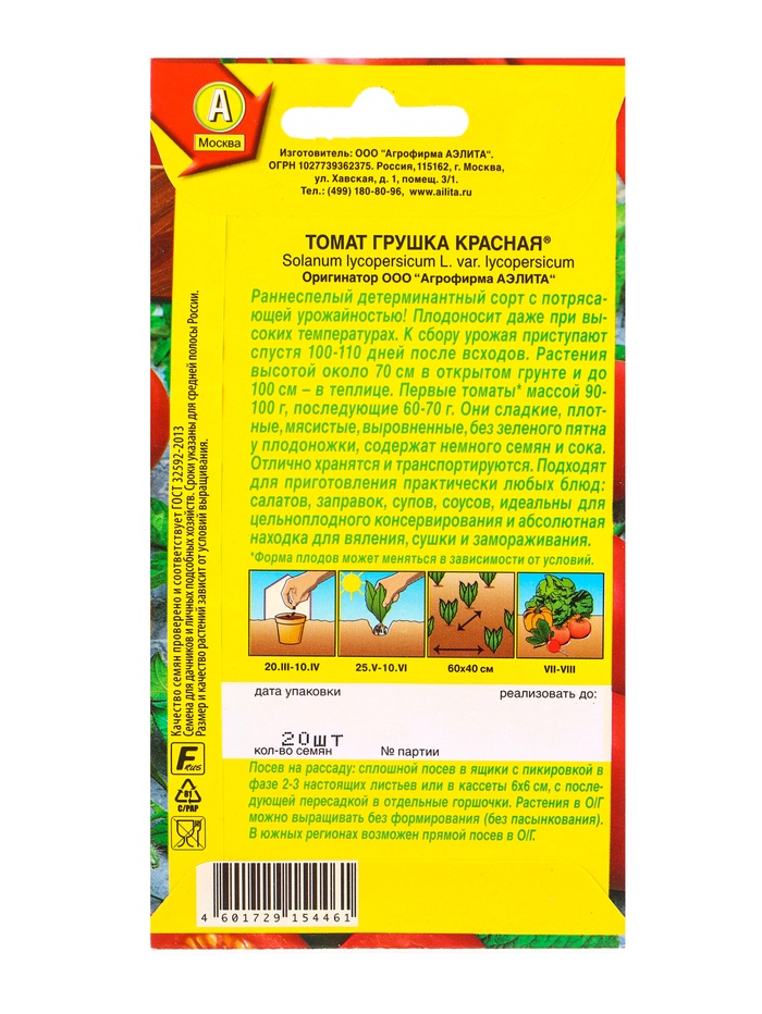 Семена Томат Грушка красная Р, Ц/П,20 шт. — Характеристики