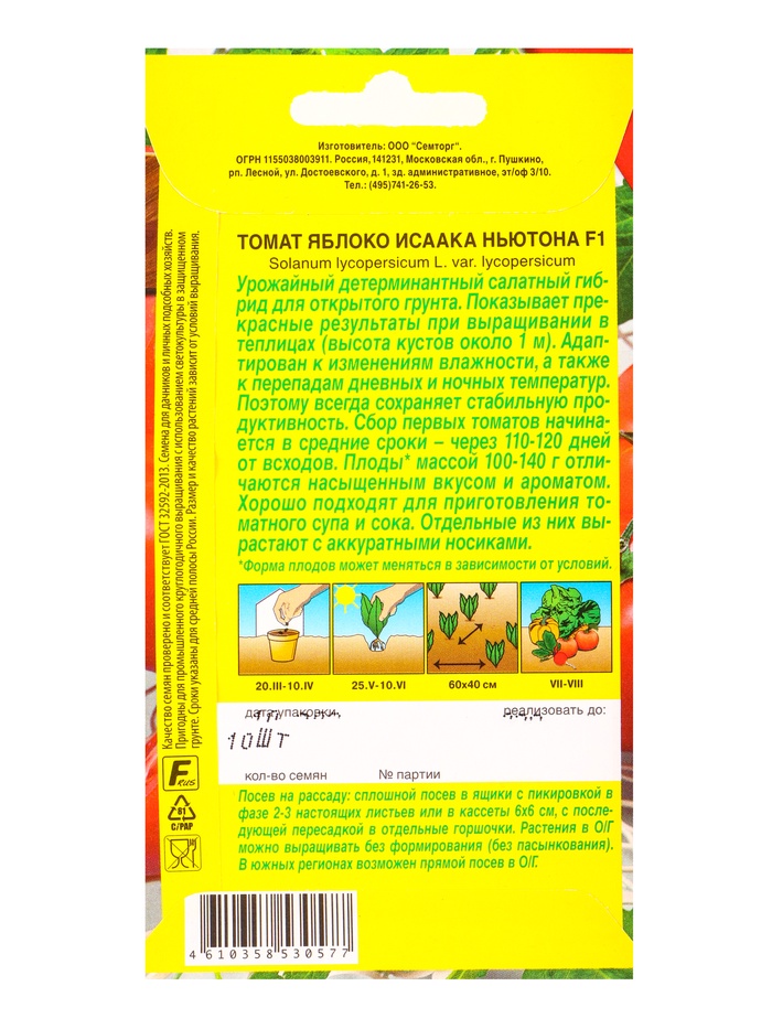 Семена Томат «Яблоко Исаака Ньютона», F1, «Семторг - Агрофирма АЭЛИТА», 10 шт. — Характеристики