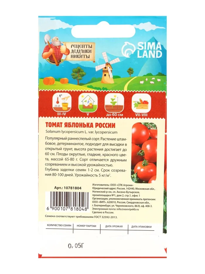 • Семена Томат "Яблонька России", 0,05 г — Характеристики