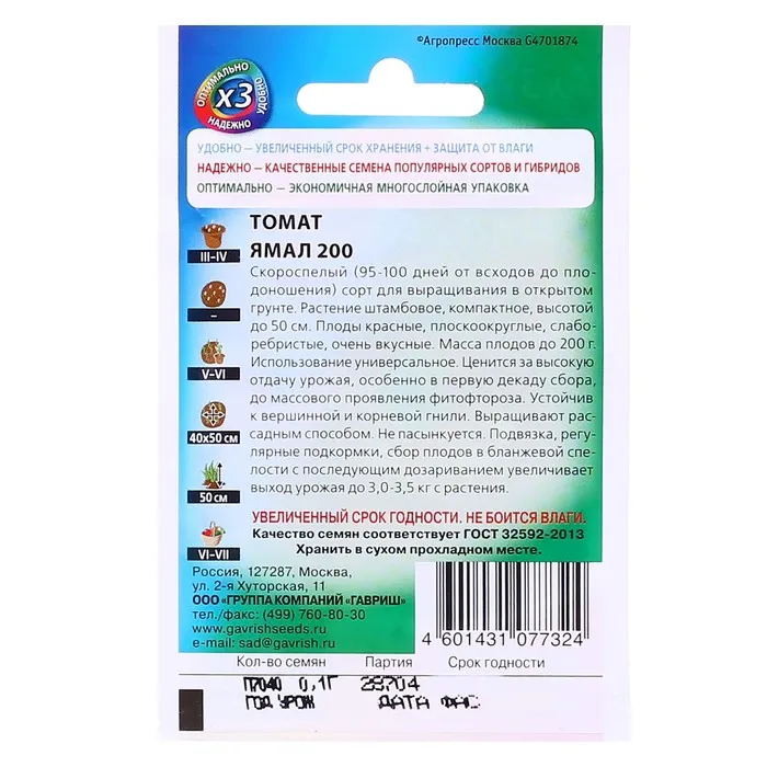 Скороспелый (95-100 дней от всходов до плодоношения) сорт для выращивания в открытом грунте. Посев на рассаду в конце марта – начале апреля. Пикировка в фазе первого настоящего листа. Высадка в грунт в конце мая-начале июня. Растение штамбовое, компактное, высотой до 50 см. Плоды красные, плоскоокруглые, слаборебристые, очень вкусные. Масса плодов до 200 г. Не пасынкуется. Ценится за высокую отдачу урожая, особенно в первую декаду сбора, до массового проявления фитофтороза. Устойчив к вершинной и корневым гнилям. Использование универсальное. Подвязка, регулярные подкормки, сбор плодов в бланжевой спелости с последующим дозариванием увеличивает выход урожая до 3 -3,5 кг с растения.