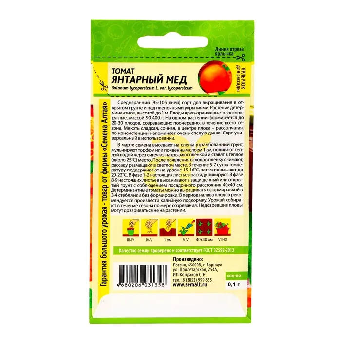 Среднеранний (95-105 дней) сорт для выращивания в открытом грунте и под пленочными укрытиями. Растение детерминантное, высотой до 1 м. Плоды ярко-оранжевые, плоскоокруглые, массой 90-400 г. На одном растении формируется до 20-30 плодов, созревающих поочередно, в течение всего сезона. Мякоть сладкая, сочная, в центре плода - рассыпчатая, по консистенции напоминает очень спелую дыню. Сорт универсальный в использовании. В марте семена высевают на слегка утрамбованный грунт, мульчируют торфом или почвенным слоем 1 см, поливают теплой водой через ситечко, накрывают пленкой и ставят в теплое (около 25°С) место. После появления всходов пленку снимают, рассаду размещают в светлом месте. В течение 5-7 суток температуру поддерживают на уровне 15-16°С, затем повышают до 20-22°С. В фазе 1-2 настоящих листьев рассаду пикируют. 60-65-дневную рассаду в фазе 6-7 настоящих листьев и хотя бы одной цветочной кисти высаживают в защищенный или открытый грунт с соблюдением посадочного расстояния 40х40 см. Детерминантные томаты в открытом грунте формируют в 1-2 стебля, в теплице – в 3-4 стебля. Томаты хорошо отзываются на редкий, но обильный полив. При выращивании в теплице рекомендованы магниевые подкормки по вегетации. В период налива плодов рекомендуется произвести калийную подкормку. Урожай собирают в течение сезона по мере созревания. Недозревшие плоды могут дозариваться не на растении.