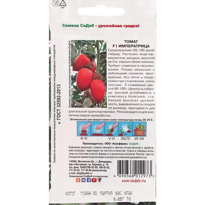 Среднеранний (95-100 дней) гибрид. Растение индетерминантное, мощное, высотой до 2м, хорошо облиственное. Требует подвязки и пасынкования. Плоды овальные с небольшим носиком, ярко-красные, без пятна у плодоножки при созревании, очень плотные, 2-х камерные, массой 90-100 г.