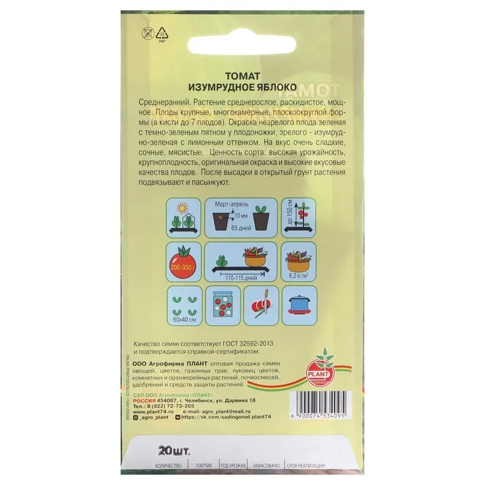 Среднеспелый (110-120 дней) сорт для пленочных теплиц и открытого грунта. Растение индетерминантное, среднерослое, высотой 1,2-1,5 м. В кисти формируется 3-5 плодов.