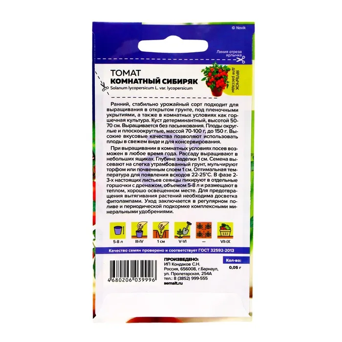Ранний стабильно урожайный сорт подходит для выращивания в открытом грунте, под пленочными укрытиями, а так же в комнатных условиях как горшечная культура. Куст детерминантный, высотой 50-70 см. Выращивается без пасынкования. Плоды округлые и плоскоокруглые, массой 70-100 г, до 150 г. Высокие вкусовые качества позволяют использовать плоды в свежем виде и для консервирования. При выращивании в комнатных условиях посев возможен в любое время года. Рассаду выращивают в небольших ящиках. Глубина заделки 1 см. Семена высевают на слегка утрамбованный грунт, мульчируют торфом или почвенным слоем 1 см. Оптимальная температура для появления всходов 22-25°С. В фазе 2-3-х настоящих листьев сеянцы пикируют в отдельные горшочки с дренажом, объемом 5-8 л и размещают в теплом, хорошо освещенном месте. Для предотвращения вытягивания растений необходима досветка фитолампами. Уход заключается в редком, но обильном поливе и 2-3-х кратной подкормке комплексными минеральными удобрениями.