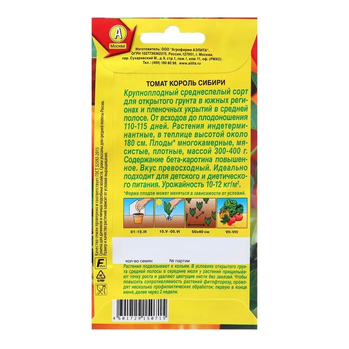 Семена Томат Король Сибири Ср Ц/П 20шт — Характеристики