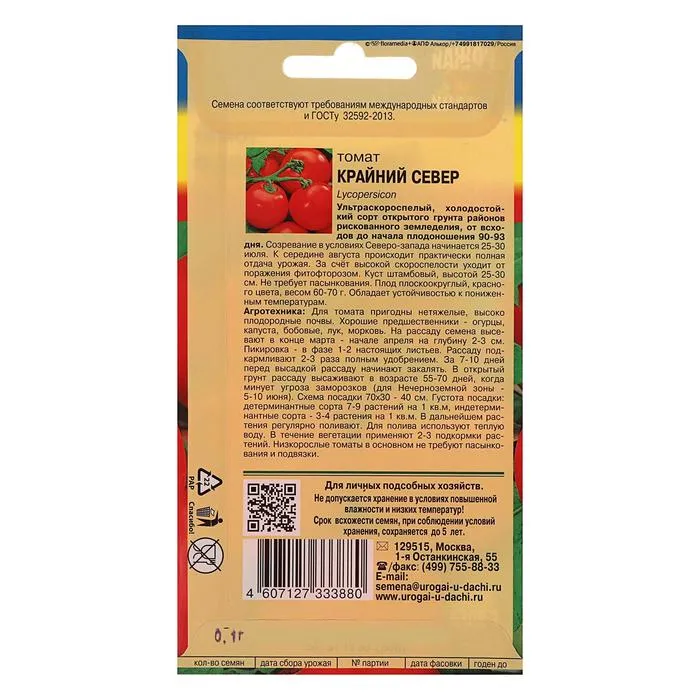 Ультраскороспелый, холодостойкий сорт открытого грунта районов рискованного земледелия, от всходов до начала плодоношения 90-93 дня. Созревание в условиях Северо-запада начинается 25-30 июля. К середине августа происходит практически полная отдача урожая. За счёт высокой скороспелости уходит от поражения фитофторозом. Куст штамбовый, высотой 25-30 см. Не требует пасынкования. Плод плоскоокруглый, красного цвета, весом 60-70 г. Обладает устойчивостью к пониженным температурам.