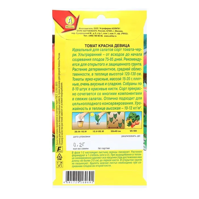 Идеальный для салатов сорт томата-черри. Ультраранний – от всходов до начала созревания плодов 75-85 дней. Рекомендуется для открытого и защищенного грунта. Растение детерминантное, средней облиственности, в теплице высотой 120-130 см. Томаты ярко-красные, массой 15-20 г, плотные, очень вкусные и сладкие. Собраны по 8-10 штук в красивые кисти. Сорт прекрасно сочетается со многими компонентами в свежих салатах. Отлично подходит для цельноплодного консервирования. Урожайность в теплице высокая – 10-12 кг/ м2.