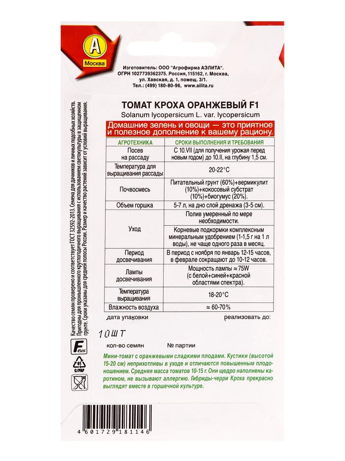 Семена Томат «Кроха Оранжевый», F1, «Зимний огород - АЭЛИТА», 10 шт. — Характеристики