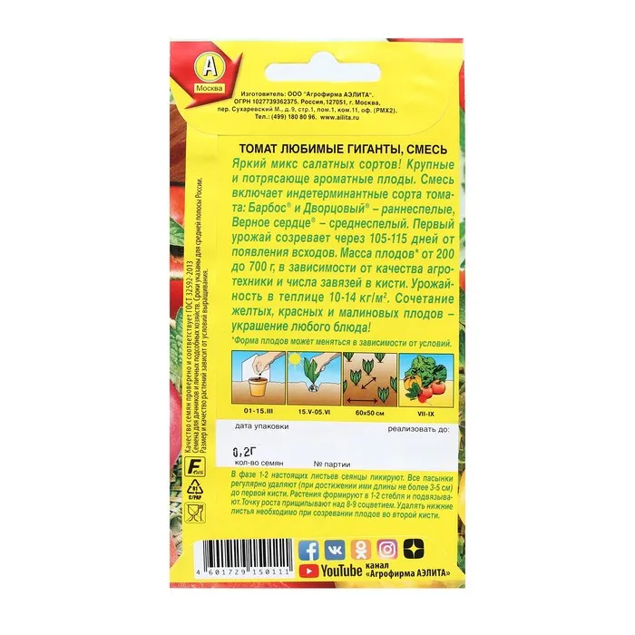 Крупные и потрясающе ароматные плоды. Смесь включает индетерминантные сорта томата: Барбос и Дворцовый – раннеспелые, Верное сердце – среднеспелый. Первый урожай созревает через 105-115 дней от появления всходов. Масса плодов от 200 до 700 г, в зависимости от качества агротехники и числа завязей в кисти. Урожайность в теплице 10-14 кг/м2. Сочетание желтых, красных и малиновых плодов – украшение любого блюда. Форма плодов может меняться в зависимости от условий.