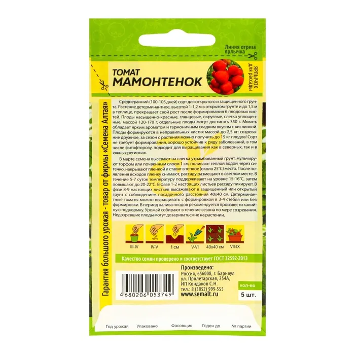Среднеранний (100-105 дней) сорт для открытого и защищенного грунта. Растение детерминантное, высотой 1-1,2 м в открытом грунте и до 1,5 м в теплице, прекращает свой рост после формирования 6 плодовых кистей. Плоды насыщенно-красные, глянцевые, округлые, слегка уплощенные, массой 120-170 г, отдельные плоды могут достигать 350 г. Мякоть обладает ярким ароматом и гармоничным сладким вкусом с кислинкой. Плоды формируются в неправильных кистях массой до 2,5 кг; созревание дружное, за сезон с растения можно получить до 15 кг плодов! Сорт не требует формирования, хорошо устойчив к ряду заболеваний, в том числе фитофторозу, подходит для выращивания как в северных, так и в южных регионах. В марте семена высевают на слегка утрамбованный грунт, мульчируют торфом или почвенным слоем 1 см, поливают теплой водой через ситечко, накрывают пленкой и ставят в теплое (около 25°С) место. После появления всходов пленку снимают, рассаду размещают в светлом месте. В течение 5-7 суток температуру поддерживают на уровне 15-16°С, затем повышают до 20-22°С. В фазе 1-2 настоящих листьев рассаду пикируют. 60-65-дневную рассаду в фазе 6-7 настоящих листьев и хотя бы одной цветочной кисти высаживают в защищенный или открытый грунт с соблюдением посадочного расстояния 40х40 см. Детерминантные томаты в открытом грунте формируют в 1-2 стебля, в теплице – в 3-4 стебля. Томаты хорошо отзываются на редкий, но обильный полив. При выращивании в теплице рекомендованы магниевые подкормки по вегетации. В период налива плодов рекомендуется произвести калийную подкормку. Урожай собирают в течение сезона по мере созревания. Недозревшие плоды могут дозариваться не на растении.
