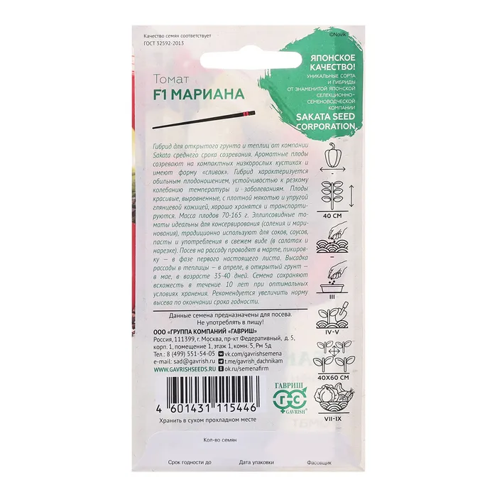 Томат Мариана F1 Solanum Lycopersicum L. var. Mariana F1 Семена от японской фирмы Sakata Очень ранний детерминантный гибрид для открытого грунта, временных укрытий и плёночных теплиц. Плоды сливовидной формы, массой 160-180 грамм, ярко красного цвета. Устойчив к растрескиванию. Пригоден для свежего потребления, цельноплодного консервирования очищенными от шкурки. Плоды долгое время держатся на кисти без потери вкусовых и товарных качеств. Отлично хранятся и без проблем транспортируются на дальние расстояния.. Оптимальный возраст рассады для высадки в грунт 30-35 дней. Десертные вкусовые качества достигаются только при условии созревания плодов на растении, что наступает через 6-10 дней после достижения красного цвета. Растение формируется в зависимости от условий выращивания.