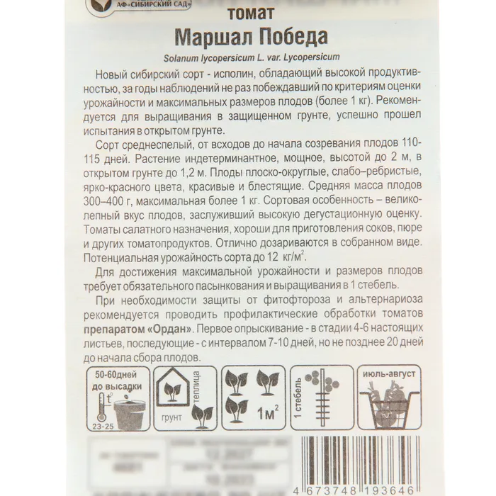 Сорт среднеспелый, от всходов до начала созревания плодов 110- 115 дней. Растение индетерминантное, мощное, высотой до 2 м, в открытом грунте до 1,2 м.