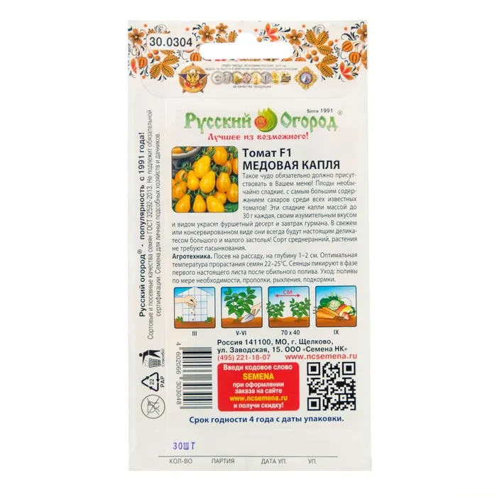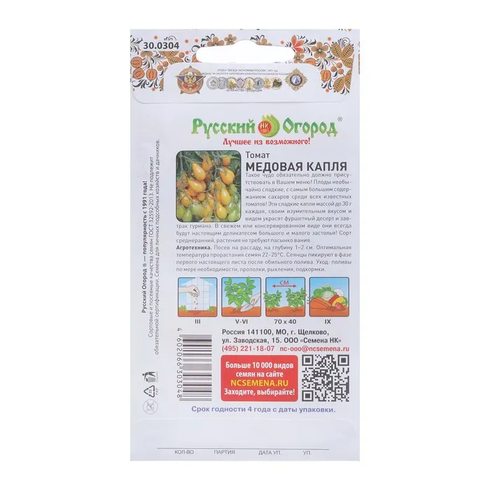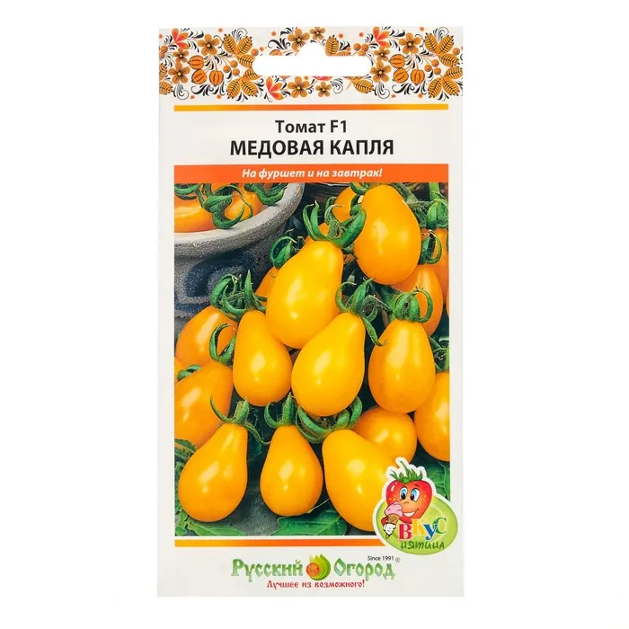 Раннеспелый (от всходов до плодоношения 100–110 дней) высокорослый сорт для выращивания в открытом грунте и пленочных теплицах. Плоды каплевидной формы, гладкие, медового цвета, массой 30 г, с приятным сладковатым вкусом и нежным томатным ароматом. Из сорта Медовая капля получаются аппетитные и яркие свежие салаты, соленья, маринады, вкусные закуски и канапе. Посев на рассаду — в марте–начале апреля. Пикировка рассады в фазе первого настоящего листа. Посадка рассады в грунт — начало–середина мая или конец мая–начало июня. Растение требует пасынкования и подвязки. Семена после уборки сохраняют всхожесть в течение 10 лет при оптимальных условиях хранения. Рекомендуется увеличить норму высева по истечении срока годности.