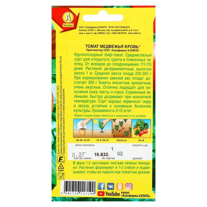Крупноплодный биф-томат. Ранний сорт для открытого грунта и пленочных теплиц. Растения детерминантные, высотой около 1 м. Средняя масса плода 200-300 г. При нормировании завязей вес плода достигает 500 г. Томаты мясистые, ароматные, очень вкусные. Урожайность 9-12 кг/м2.