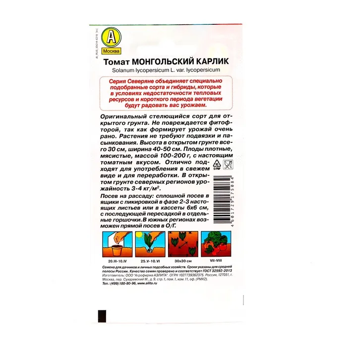 Томат Монгольский карлик относится к группе самых ранних и низкорослых томатов. Плоды достаточно крупные, весом до 200 гр., красного цвета, мясистые и сбалансированные по вкусу. Не требует пасынкования и подвязки. Супердетерминантный сорт для открытого грунта. Высота всего около 30см и примерно 1м в диаметре. Когда ствол достигает 20-30 см, он начинает резко изгибаться вниз. Куст стелется, образуя несколько хорошо развитых побегов. Растение отличается особо крепкой корневой системой, которая расположена близко к поверхности земли. На основном стебле после его высадки в грунт начинает формироваться большое количество пасынковых отростков, на которых в дальнейшем будет по 3-4 плода средней величины. Куст нельзя подвязывать к опорам. Сорт устойчив к фитофторозу. Плоды могут долго сохранять свой товарный внешний вид и не трескаться даже находясь на ветке в условиях влажного климата. Высокая урожайность сорта – около 10 кг помидоров с одного куста!