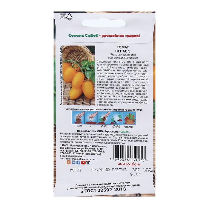 Интересный «солнечный» сорт от компании СеДек, выращивать который легко – томат Непас 5 (непасынкующийся оранжевый с носиком). Купить семена оригинального качества от производителя вы можете в нашем интернет – магазине. Низкорослые штамбовые кустики, высотой не более 60 см, можно высаживать и на открытом участке, и под пленкой – они не займут много места. На вегетацию растению потребуется совсем немного времени – всего около 100-105 суток с момента первых всходов. С благодарностью относится к подкормкам, пасынкования и прищипывания не требует. Главная ценность сорта в высокой урожайности, привлекательности и лежкости плодов. Помидоры среднего размера, около 70 г, имеют яркий оранжевый цвет, вытянутые, со слабо выраженными ребрами и «носиком». Плотная кожица обеспечивает безопасную транспортировку и пригодность к цельноплодной консервации. Их также можно солить, добавлять в салаты.