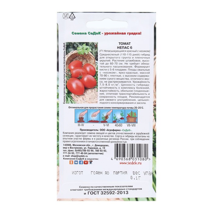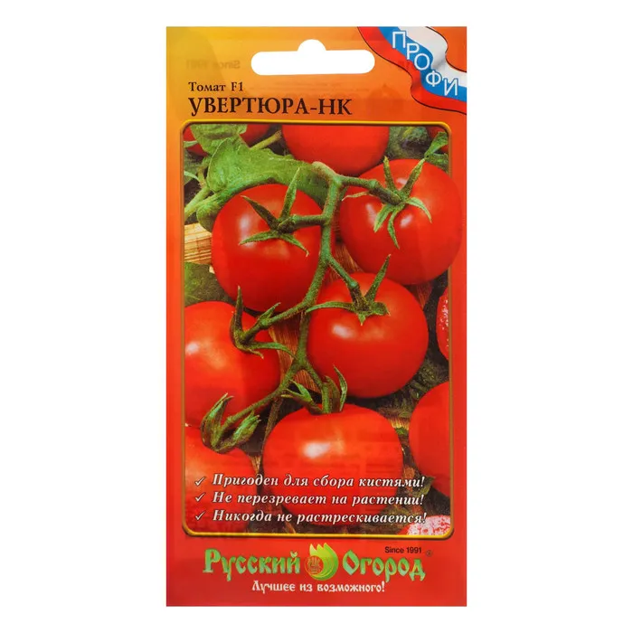 Среднеспелый (110-115 дней) гибрид для открытого грунта и пленочных укрытий. Растение штамбовое, высотой до 60-70 см. Не требует обязательного пасынкования. Формирует кисти с 5-6 плодами. Плоды овальные с «носиком», ярко-красные, массой 70-90 г, плотные, с высоким содержанием сухого вещества, отличного вкуса, не растрескиваются. Урожайность 7,5-8,0 кг/м2. Ценность гибрида: устойчивость к комплексу болезней, жаростойкость, обильное плодоношение, отличная транспортабельность и сохранность плодов. Рекомендуется для свежего употребления, цельноплодного консервирования и засола.
