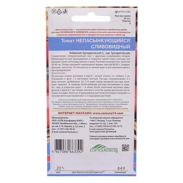 Скороспелый суперурожайный сорт с дружным созреванием плодов. Рекомендуется для выращивания в открытом грунте через рассаду, или посевом семян непосредственно в грунт. Растение низкорослое, высотой 30-40 см. Плоды красивой сливовидной формы, массой 80-90 г, гладкие, плотные, мясистые. Используются в свежем виде и для цельноплодного консервирования.