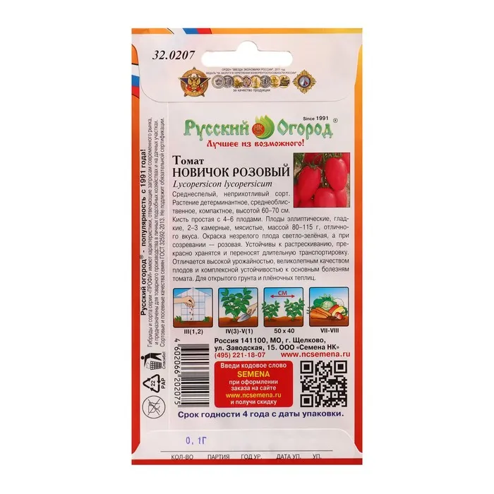 Среднеспелый (114-120 дней от всходов до плодоношения) консервный сорт для открытого грунта. Растение детерминантное, компактное, средневетвистое, среднеоблиственное, высотой 50-80 см. Первое соцветие закладывается над 6-7-м листом. Плоды овальные, гладкие, розовые, массой 80-115 г. Прекрасно подходят для салатов, цельноплодного консервирования. Схема посадки 40х60 см. Сорт устойчив к галловой нематоде. Урожайность товарных плодов 5,9 кг/м2.