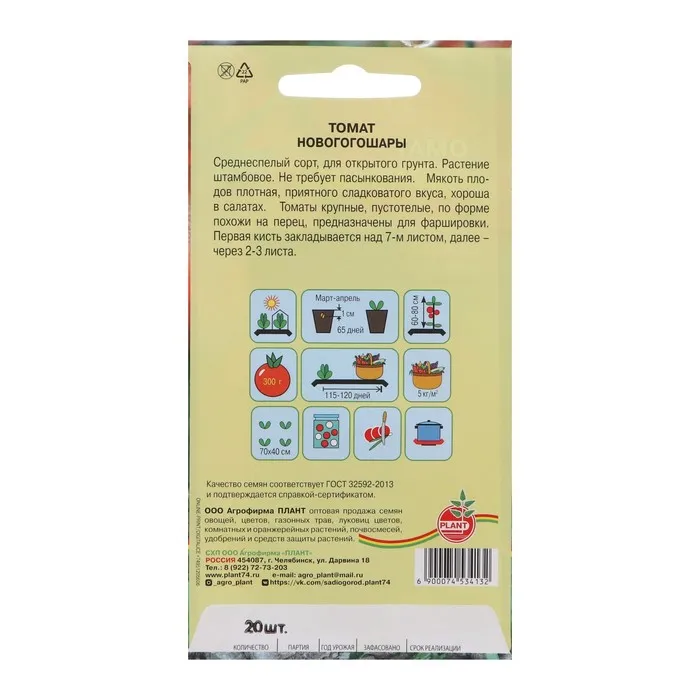 Рекомендуемая схема посадки 70х40 см. Высотой томата 60-80 см.
