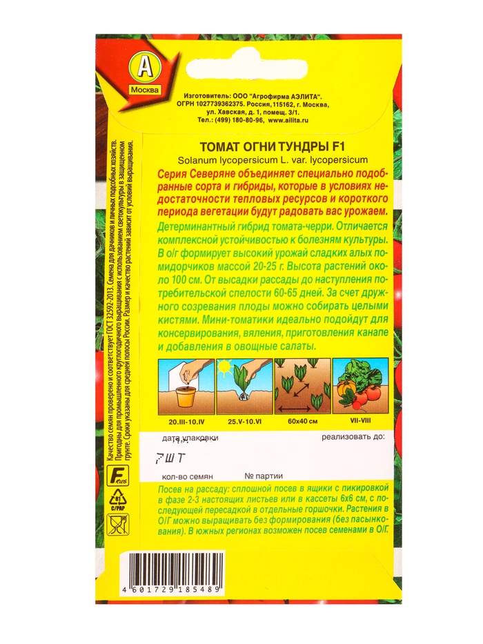 Семена Томат «Огни Тундры», F1, «Северяне - Агрофирма АЭЛИТА», 7 шт. — Характеристики
