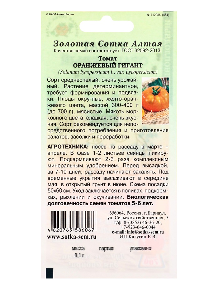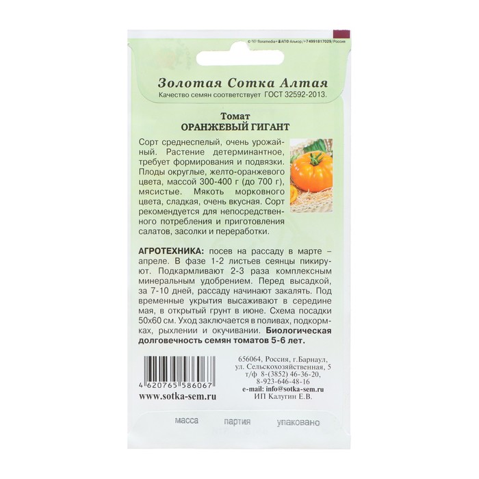 Семена Томат «Оранжевый Гигант», среднеспелый, 0.1 г, «Золотая Сотка Алтая» — Характеристики