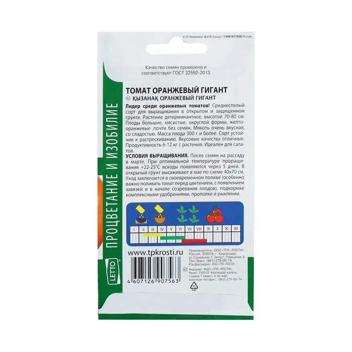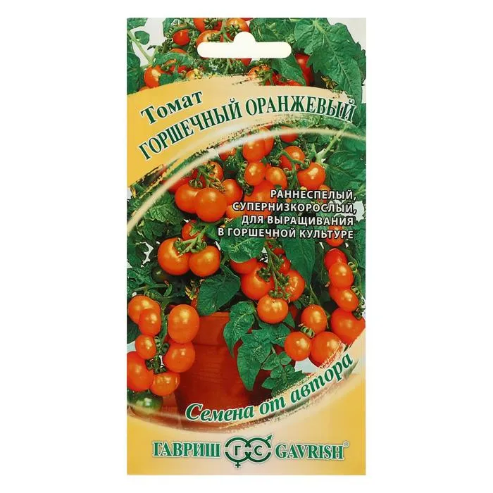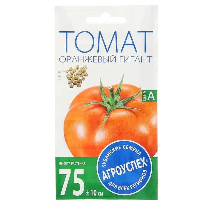 Семена «Томат Оранжевый гигант», средний, низкорослый, 0,2 г — среднеспелый сорт для выращивания в открытом и защищённом грунте. Растение детерминантное, высотой 70–80 см. Плоды большие, мясистые, округлой формы, жёлто-оранжевые, почти без семян. Мякоть очень вкусная, со сладостью. Масса плода: 300 г и более. Сорт устойчив к растрескиванию. Продуктивность: 6–12 кг с растения.