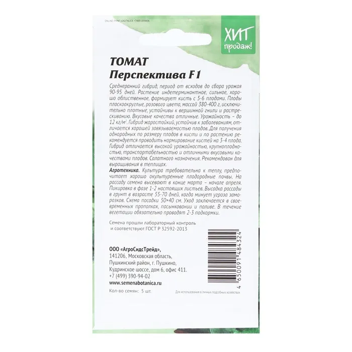 Перспектива F1 – среднеранний индетерминантный гибрид томата (90-95 дней от всходов до начала созревания). Рекомендуется для выращивания в первом и втором обороте пленочных теплиц. Корневая система активная. Растение мощное, вегетативного типа, лист от среднего до крупного, темно-зеленый, расположение пониклое. Первое соцветие закладывается над 10-12 листом, последующие через 3 листа. Соцветие простое с 5-6-ю плодами.