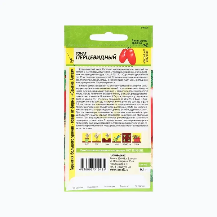 Среднеспелый сорт. Растение индетерминантное, высотой до 150 см. В кисти формируется по 5-9 красивых красных, очень плотных, перцевидных плодов массой 75-150 г. Сорт очень урожайный (до 15 кг плодов с одного куста). Отличные вкусовые качества позволяют использовать плоды в свежем виде и для цельноплодного консервирования. Хорошо хранится. В марте семена высевают на слегка утрамбованный грунт, мульчируют торфом или почвенным слоем 1 см, поливают теплой водой через ситечко, накрывают пленкой и ставят в теплое (около 25°С) место. После появления всходов пленку снимают, рассаду размещают в светлом месте. В течение 5-7 суток температуру поддерживают на уровне 15-16°С, затем повышают до 20-22°С. В фазе 1-2 настоящих листьев рассаду пикируют. 60-65-дневную рассаду в фазе 6-7 настоящих листьев и хотя бы одной цветочной кисти высаживают в защищенный или открытый грунт с соблюдением посадочного расстояния 40х40 см. Индетерминантные томаты формируют в 1, реже в 2 стебля, удаляя пасынки. При достижении растениями верха теплицы основной стебель прищипывается. Томаты хорошо отзываются на редкий, но обильный полив. При выращивании в теплице рекомендованы магниевые подкормки по вегетации. В период налива плодов рекомендуется произвести калийную подкормку. Урожай собирают в течение сезона по мере созревания. Недозревшие плоды могут дозариваться не на растении.