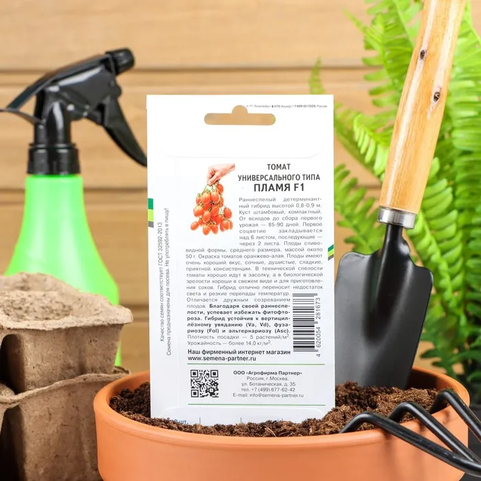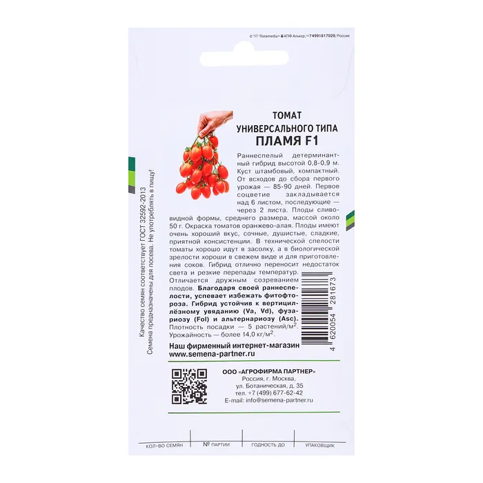 Раннеспелый детерминантный гибрид высотой 0,8-0,9 м. Куст штамбовый, компактный. От всходов до сбора первого урожая — 85- 90 дней. Первое соцветие закладывается над 6 листом, последующие — через 2 листа. Плоды сливовидной формы, среднего размера, массой около 50 г. Окраска томатов оранжево–алая. Плоды имеют очень хороший вкус, сочные, душистые, сладкие, приятной консистенции. В технической спелости томаты хорошо идут в засолку, а в биологической хороши в свежем виде и для приготовления соков. Гибрид отлично переносит недостаток света и резкие перепады температур. Отличается дружным созреванием плодов. Благодаря своей раннеспелости, успевает избежать фитофтороза. Гибрид устойчив к вертициллёзному увяданию (Va, Vd), фузариозу (Fol) и альтернариозу (Asc). Плотность посадки — 5 растений/м². Урожайность — более 14,0 кг/м².