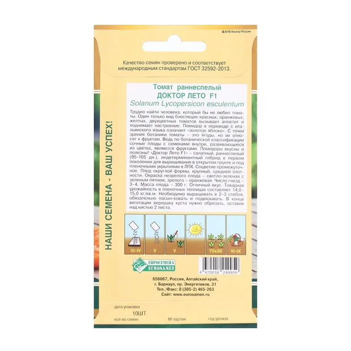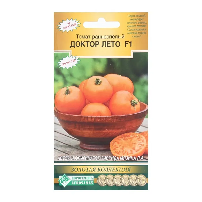 Помидоры вкусны и полезны. Доктор Лето F1 -салатный, раннеспелый (95-105 дн.), индетерминантный гибрид в первом поколении для выращивания в открытом грунте и под пленочными укрытиями в ЛПХ. Соцветие промежуточное.Плод округлой формы, крупный, средней плотности. Окраска незрелого плода- светло-зеленая с зеленым пятном, зрелого - оранжевая. Число гнезд – 3-4. Масса плода - 300 г. Отличный вкус.