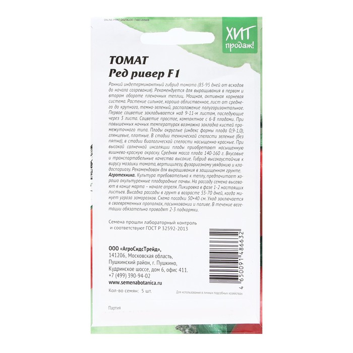 Ред Ривер F1 – ранний индетерминантный гибрид томата (85-95 дней от всходов до начала созревания). Рекомендуется для выращивания в первом и втором обороте пленочных теплиц. Мощная, активная корневая система. Растение сильное, хорошо облиственное, лист от среднего до крупного, темно-зеленый, расположение полугоризонтальное. Первое соцветие закладывается над 9-11 листом, последующие через 3 листа. Соцветие простое, компактное с 6-8-ю плодами. При повышенных ночных температурах возможна закладка кистей промежуточного типа.