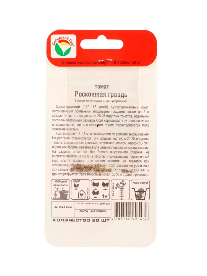 Среднеранний (110-115 дней) суперурожайный сорт, восхищающий обильными плодовыми гроздями, весом до 2 кг каждая. В кисти в среднем по 20-25 округлых томатов, идеальной засолочной формы и размера. Сорт хорошо растет и плодоносит как в защищенном, так и в открытом грунте, характеризуется 100% завязываемостью.
