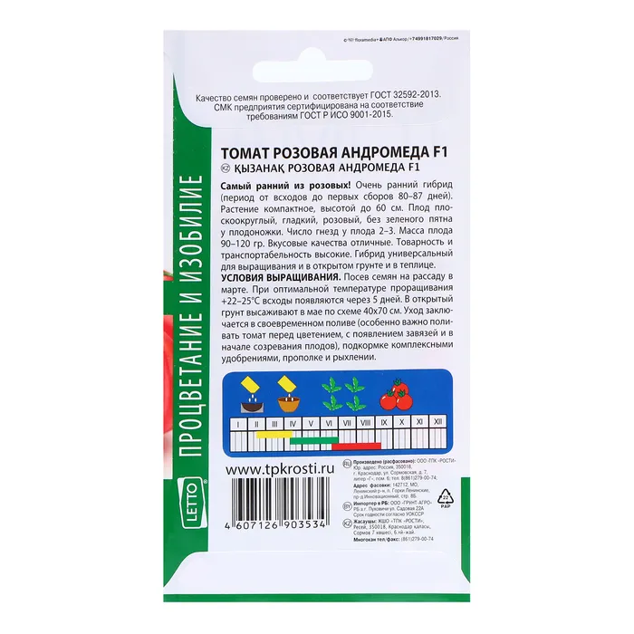 Самый ранний из розовых. Очень ранний гибрид (период от всходов до первых сборов 80-87 дней). Растение компактное, высотой до 60 см. Плод плоско-округлый, гладкий, розовый, без зеленого пятна у плодоножки. Число гнезд у плода 2-3. Масса плода 90-120 гр. Вкусовые качества отличные. Товарность и транспортабельность высокие. Гибрид универсальный для выращивания и в открытом грунте и в теплице. Условия выращивания. Посев семян на рассаду в марте. При оптимальной температуре проращивания +22-25°С всходы появляются через 5 дней. В открытый грунт высаживают в мае по схеме 40х70 см. Уход заключается в своевременном поливе (особенно важно поливать томат перед цветением, с появлением завязей и в начале созревания плодов), подкормке комплексными удобрениями, прополке и рыхлении.