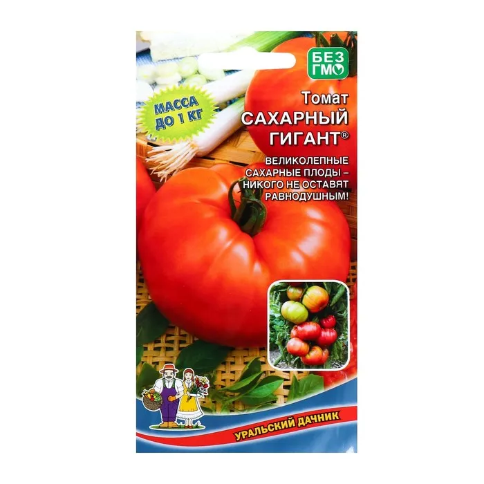 «Сахарный гигант» — среднеспелый сорт томата для открытого грунта и теплиц. Куст высотой 1,5 метра украшают крупные плоды массой до 600 г. Все они сахаристые, с плотной кожицей, поэтому не трескаются. Урожайность — до 6 кг с куста.