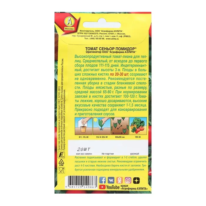 Высокопродуктивный томат-лиана для теплиц. Среднеспелый, от всходов до первого сбора плодов 111-115 дней. Индетерминантный, достигает высоты 3 м. Растения слабооблиственные, генеративного типа. Плоды в больших сложных кистях по 20-30 шт, созревают не одновременно. Рекомендуется постепенная уборка в стадии бланжевой спелости. За сезон на стебле образуется 4-5 кистей. Плоды гладкие, мясистые, разные по размеру, средней массой 65-80 г. При нормировании завязей в кистях достигают 180-200 г. Томаты лежкие, хорошо дозариваются, высокие вкусовые качества сохраняют 1-1,5 месяца. Урожайность при достаточном питании – 20-25 кг с куста. Сорт сравнительно устойчив к фитофторозу.