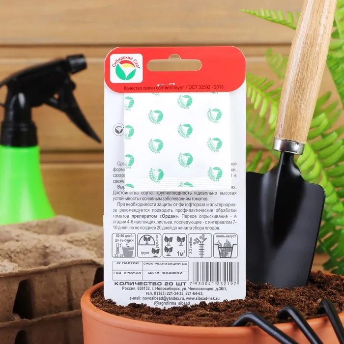 Среднеспелый плод, выведенный в Сибири, отличается особенно крупными плодами, которые могут достигать массы в 900 г. Детерминантный куст вырастает на 130 см и отдаёт хороший урожай даже в неблагоприятных погодных условиях.
