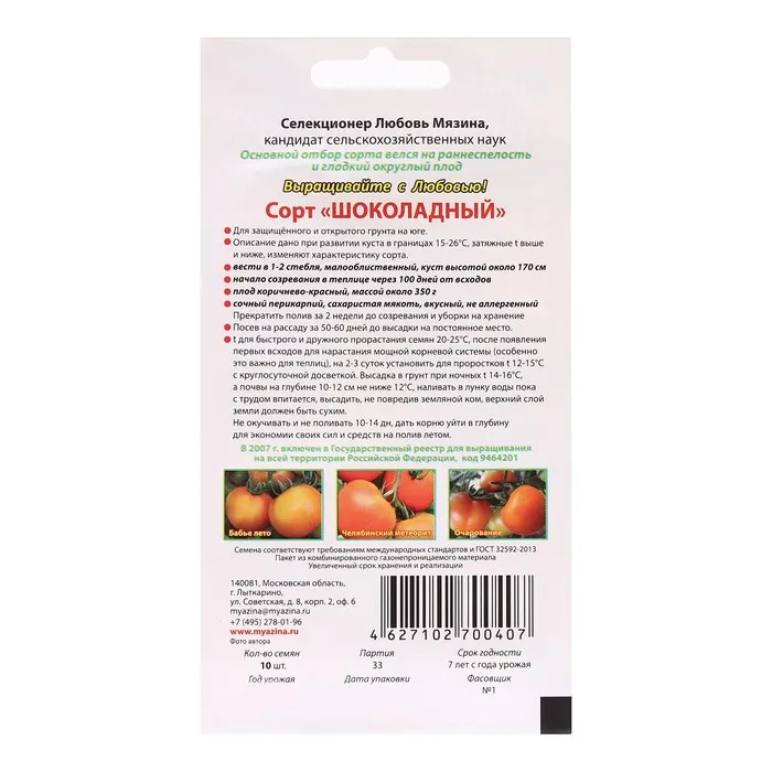 Среднеранний сорт для выращивания в открытом или защищенном грунте. Растение полудетерминантное, высотой 110-150 см. Томат коктейльного типа, в кисти формируется по 5-8 плодов шоколадного цвета, массой 100-250 г. Мякоть сладкая, сочная, нежная, красно-коричневого цвета. Для потребления в свежем виде и переработки. Хорошо устойчив к комплексу заболеваний пасленовых, листва остается здоровой до конца сезона. В марте семена высевают на слегка утрамбованный грунт, мульчируют торфом или почвенным слоем 1 см, поливают теплой водой через ситечко, накрывают пленкой и ставят в теплое (около 25°С) место. После появления всходов пленку снимают, рассаду размещают в светлом месте. В течение 5-7 суток температуру поддерживают на уровне 15-16°С, затем повышают до 20-22°С. В фазе 1-2 настоящих листьев рассаду пикируют. 60-65-дневную рассаду в фазе 6-7 настоящих листьев высаживают в защищенный или открытый грунт с соблюдением посадочного расстояния 40х40 см. Полудетерминантные томаты формируют в 1-2 стебля с переводом точки роста на боковой побег после 6-8 плодовой кисти. Томаты хорошо отзываются на редкий, но обильный полив. При выращивании в теплице рекомендованы магниевые подкормки по вегетации. В период налива плодов рекомендуется произвести калийную подкормку. Урожай собирают в течение сезона по мере созревания. Недозревшие плоды могут дозариваться не на растении.