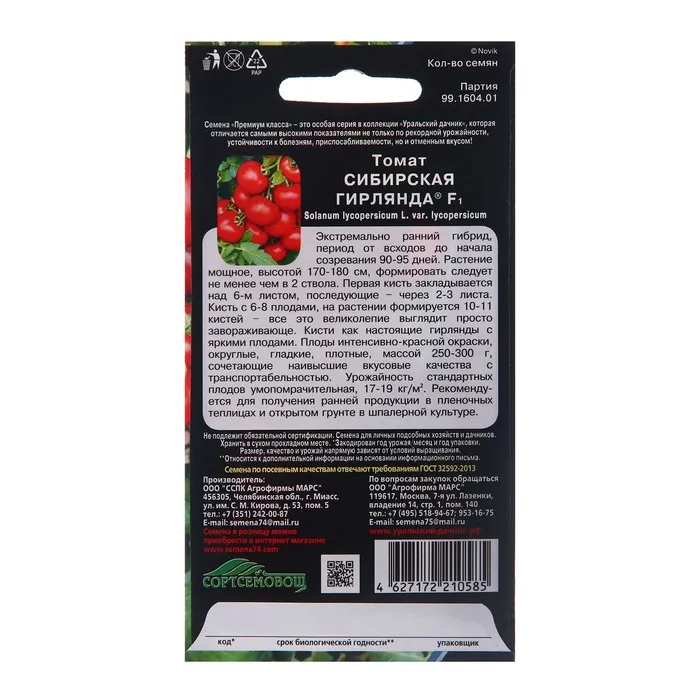 Экстремально ранний гибрид, период от всходов до начала созревания 90-95 дней. Растение мощное, высотой 170-180 см, формировать следует не менее чем в 2 ствола. Первая кисть закладывается над 6-м листом, последующие через 2-3 листа. Кисть с 6-8 плодами, на растении формируется 10-11 кистей всё это великолепие выглядит просто завораживающе, кисти как настоящие гирлянды с яркими плодами. Плоды интенсивно красной окраски, округлые, гладкие, плотные, массой 250-300г, сочетающие наивысшие вкусовые качества с транспортабельностью. Урожайность стандартных плодов умопомрачительная 17-19 кг/м².Рекомендуется для получения ранней продукции в плёночных теплицах и открытом грунте в шпалерной культуре.