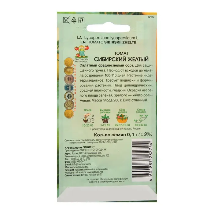 Томат Сибирский желтый - сочные, очень вкусные плоды вытянутой формы и желто-оранжевого оттенка. Салатный среднеспелый сорт, который идеально подходит для пленочных теплиц. Период от всходов до начала созревания 100-110 дней. Растение индетерминантное, требует подвязки и формирования растений. Плод цилиндрический, массой 200 г, средней плотности, гладкий. Плоды с высоким содержанием ликопина идеально подходят для украшения летних салатов.
